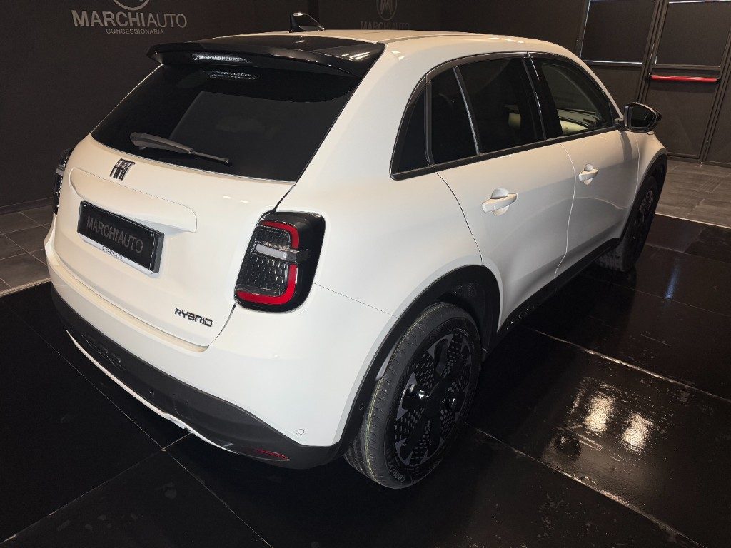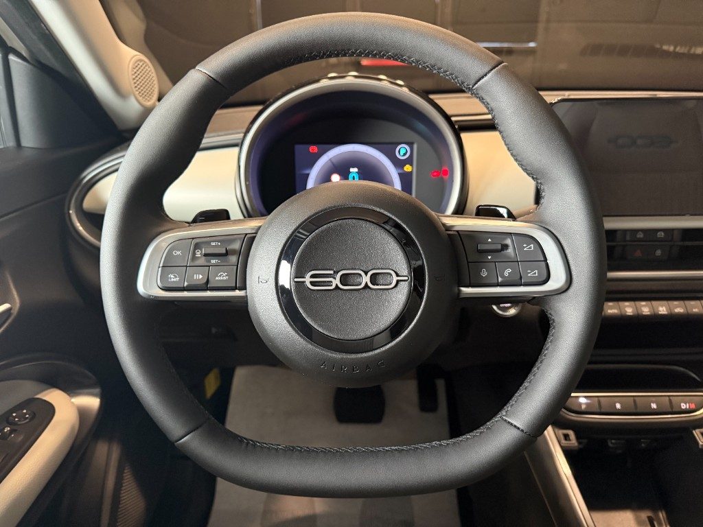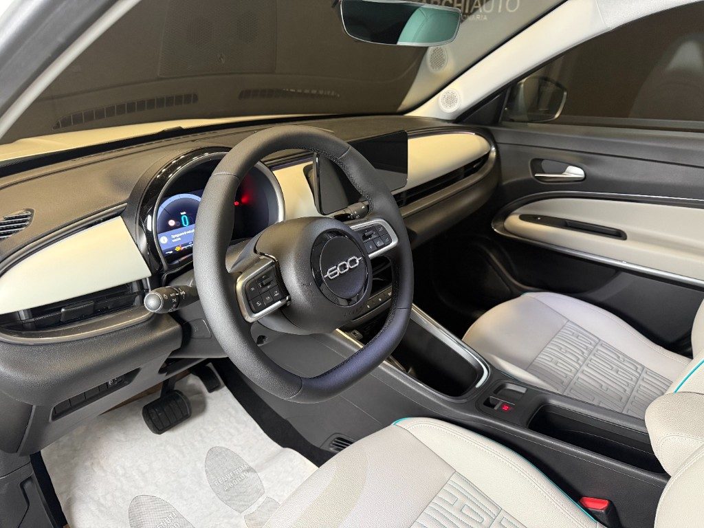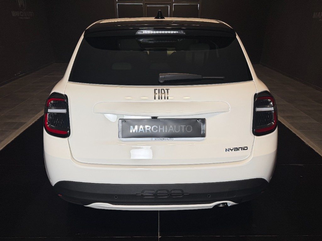 Marchi Auto propone Fiat 600 Hybrid 110 CV DCT MHEV La Prima II Km 0, auto dotata di motore 1199cc 6T ad alimentazione ibrida, funzionante ad energia elettrica e benzina. cambio automatico a 6 marce, 14 cavalli fiscali / 74 kwatt. Carrozzeria di colore bianco pastello, auto omologata per 5 persone. Gli interni di questa FIAT 600 sono in pelle colore beige. Optionals inclusi nel prezzo: ABS, Adaptive Cruise Control, Airbag, Airbag laterali, Airbag Passeggero, Airbag testa, Alzacristalli elettrici, Android Auto, Apple CarPlay, Autoradio, Autoradio digitale, Bluetooth, Boardcomputer, Bracciolo, Cerchi in lega, Chiusura centralizzata, Climatizzatore, Controllo elettronico della corsia, Controllo trazione, Controllo vocale, Cruise Control, ESP, Fari LED, Fendinebbia, Frenata d'emergenza assistita, Immobilizzatore elettronico, MP3, Riconoscimento dei segnali stradali, Sensore di luce, Sensore di pioggia, Sensori di parcheggio posteriori, Servosterzo, Sistema di navigazione, Sound system, Specchietti laterali elettrici, Telecamera per parcheggio assistito, Touch screen, USB, Vivavoce, Volante multifunzione. MARCHIAUTO